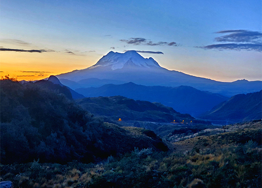 Following a rest day and night, our team drives to Chimborazo. From the trailhead, we hike two hours to our high camp just below the glacier. With a midnight alpine start, we follow a new climbing route to the west-northwest to avoid rockfall. We pass the base of a rock formation called El Castillo or “The Castle” and then climb to Chimborazo’s false summit, Pico Veintimilla. A half-hour walk across a saddle takes us to the top of the mountain at Whymper Summit, ending with one of the best views in Ecuador. We descend and transfer to a hotel near Mariscal Sucre International Airport. Ecuador, Chimborazo »